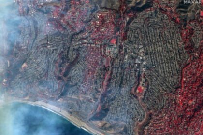 Пожарот речиси целосно уништи голем дел од Пацифик Палисадес во Лос Анџелес, покажуваат новите сателитски снимки од Maxar Technologies Сликите…