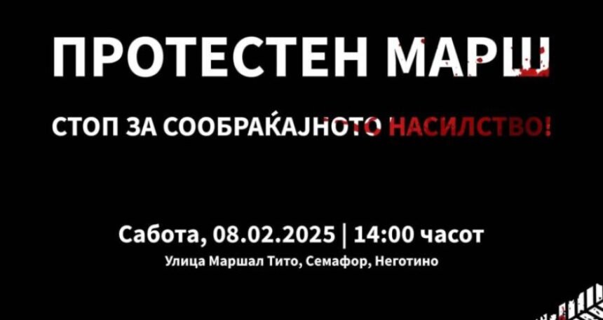 Протестен марш под мотото „Стоп за сообраќајното насилство“ ќе се одржи денеска во Неготино, објавија организаторите на настанот на социјалните мрежи. Маршот ќе започне во 14 часот на улица „Маршал Тито“.