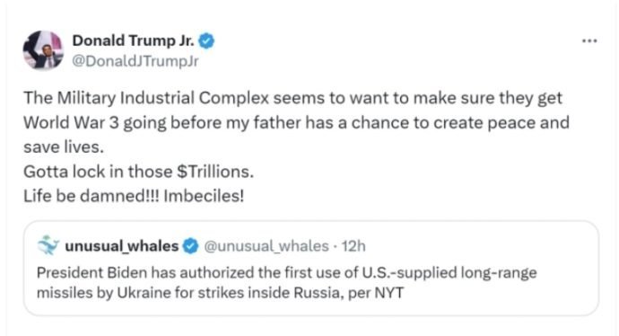 Синот на новоизбраниот американски претседател Доналд Трамп, Доналд Трамп помладиот, ја критикуваше одлуката на администрацијата на американскиот претседател Џозеф Бајден да и дозволи на Украина да користи ракети со долг дострел ATACMS за напади на руска територија.