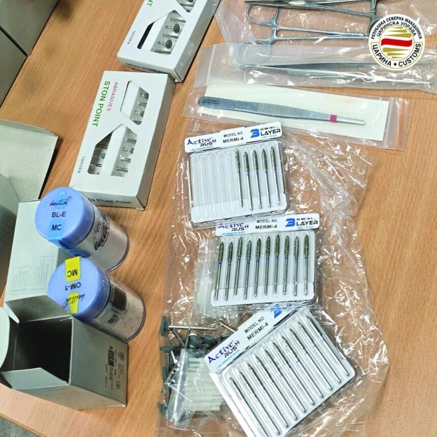 616 стоматолошки инструменти и четири килограми порцелански прав и основен порцелан за стоматологија, се откриени на Меѓународниот аеродром Скопје, при контрола на куфери во сопственост на турски државјанин кој допатувал со лет од Измир. Откако при рентгенска контрола на куферите на патникот биле забележани неправилности, била извршена детална контрола при што биле пронајдени непријавените производи. Истите се привремено задржани а против патникот е поведена прекршочна постапка.