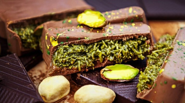 Десертот, кој во светот стана познат како чоколадо од Дубаи благодарение на „Тик-ток“, е комбинација од кремасти ф’стаци, крцкав кадаиф и чоколадо.