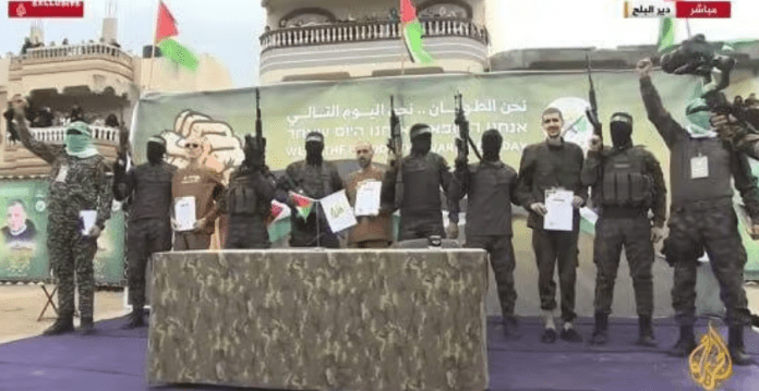 Хамас приреди и „церемонија за нивно ослободување“, на која беа принудени да дадат изјави повикувајќи го Израел да ги заврши сите фази од договорот за прекин на огнот.