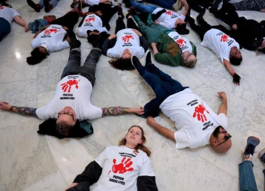 Легнаа на подот и извикуваа: „Рацете на Конгресот се крвави, одмрзнете ја сега помошта“, изразувајќи го своето несогласување со владините мерки за ограничување на активностите на УСАИД.
