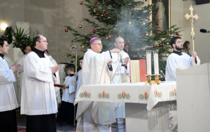 Честит празник Рождество Христово – Божиќ. Христос се роди-Славете Го!, наведе бискупот скопски и епарх струмичко – скопски Киро Стојанов на полноќната божиќна литургија во Католичката црква „Пресвето Срце Исусово“ во Скопје.