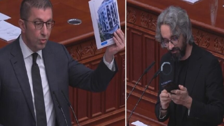 Премиерот Христијан Мицкоски на собраниска говорница денеска покажа документи поврзани со партијата Левица и нејзиниот лидер Димитар Апасиев.