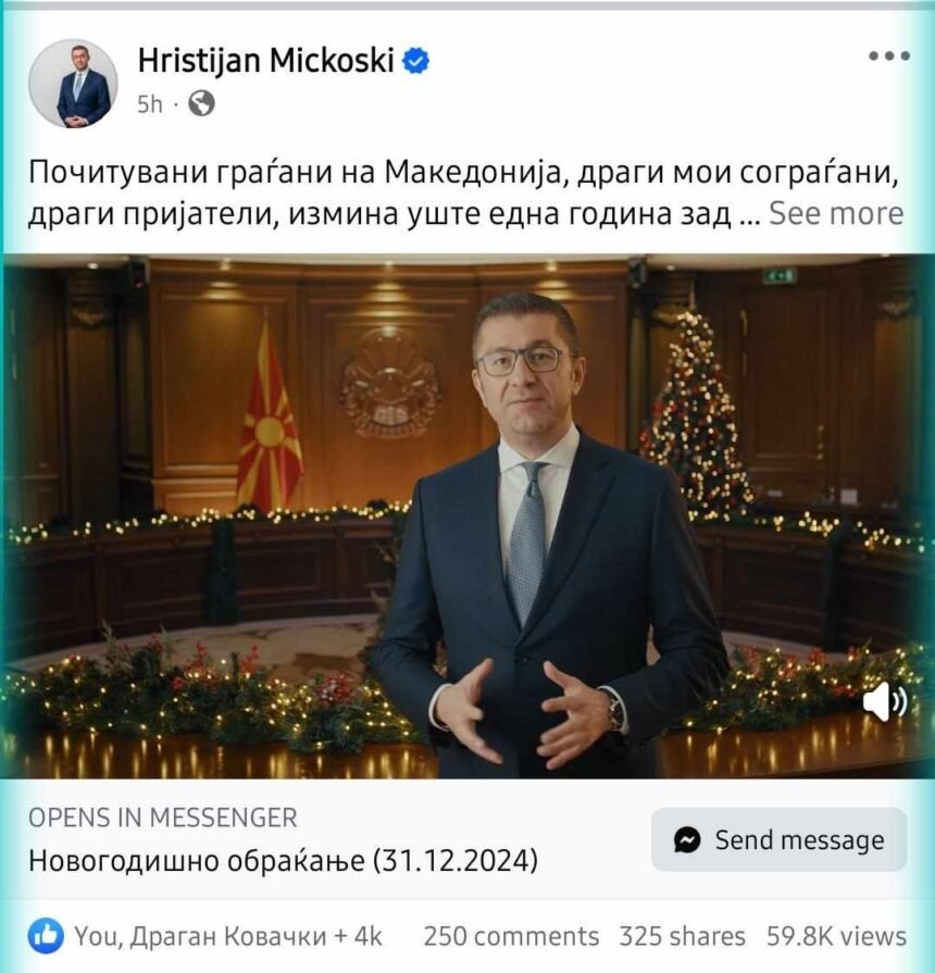 Новогодишното обраќање на премиерот Христијан Мицкоски стана вистински хит на социјалните мрежи, поставувајќи нов рекорд на гледаност! Само 5 часа по објавувањето, видеото собра над 57.000 прегледи, повеќе од 3.800 реакции, 241 коментар и 322 споделувања!