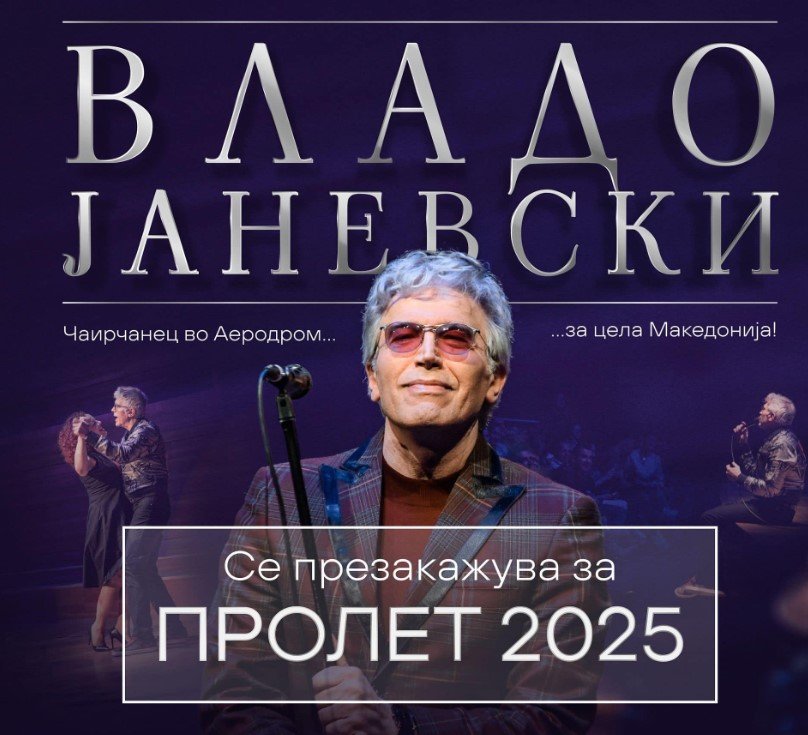 ОД ЗДРАВСТВЕНИ И ТЕХНИЧКИ ПРИЧИНИ КОНЦЕРТОТ НА ВЛАДО ЈАНЕВСКИ СЕ ПРЕЗАКАЖУВА ЗА ПРОЛЕТ 2025, информира „Авалон“ продукција.