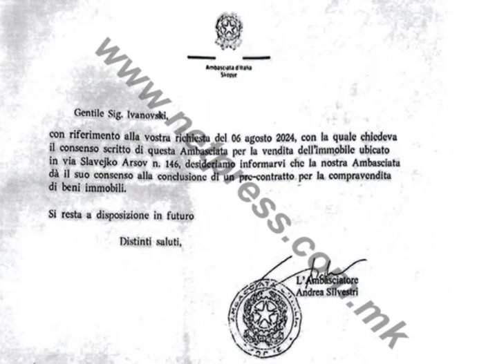 -Почитуван господине Ивановски. Во врска со вашето барање од 06.08. 2024 година, со кое побаравте писмена согласност од оваа амбасада за продажба на имотот што се наоѓа на улица „Славејко Арсов“ број 146, сакаме да ве информираме дека нашата амбасада дава согласност за склучување на преддоговор за продажба на недвижен имот. Остануваме достапни и во иднина. Со почит, амбасадор Андреа Силвестри, стои во службениот превод на незаконски изработениот документ.