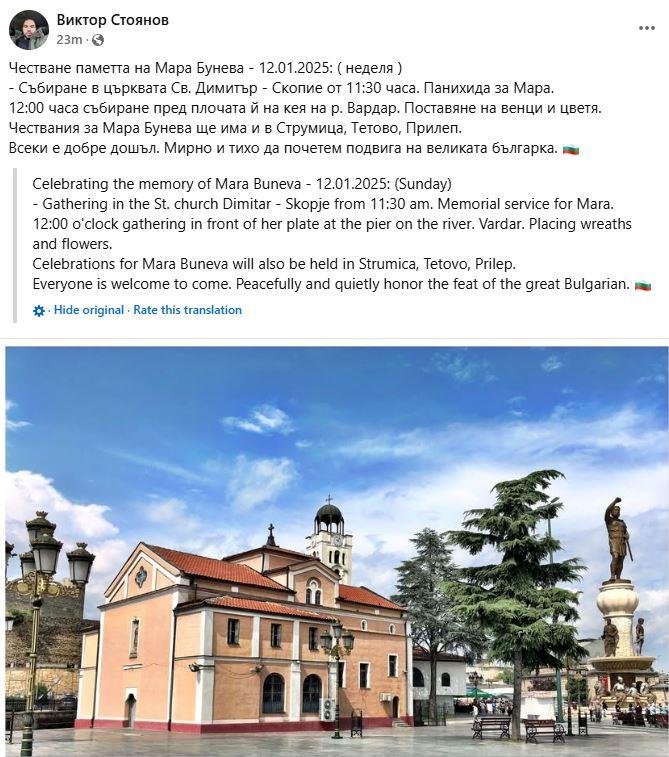 Виктор Стојанов претседателот на Фондацијата Македонија кој има забрана за влез во Македонија повикува на панихида за Мара Бунева в недела на 12 јануари на кејот на Вардар во Скопје и во црквата Свети Димитрија. Според неговата објава на социјалните мрежи, панихиди за Бунева ќе има и во Тетово, Струмица и во Прилеп.