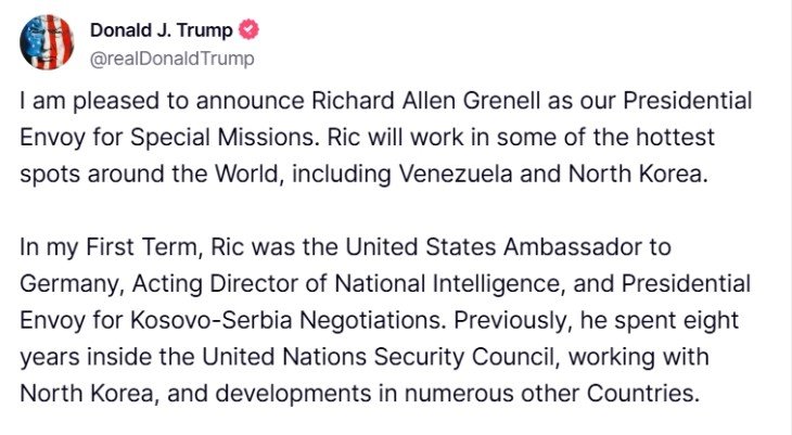 Новоизбраниот американски претседател Доналд Трамп соопшти дека ќе го назначи Ричард Гренел, поранешниот шеф на Националната разузнавачка служба, за претставник на претседателот за специјални мисии и политика кон некои непријателски држави, вклучително и Северна Кореја.
