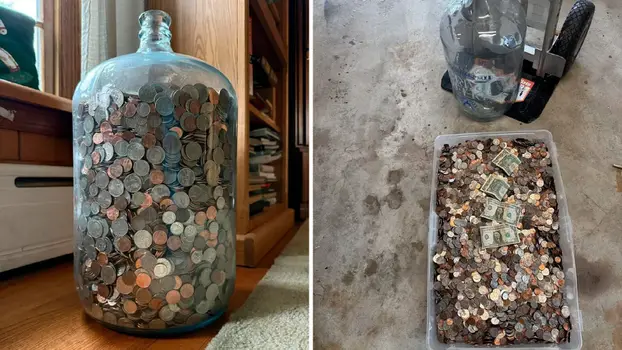 Еден Американец собирал монети цели 70 години. Наполни огромно стаклено шише. Неговиот внук ги објавил фотографиите на интернет и додал дека сега конечно може да брои пари.