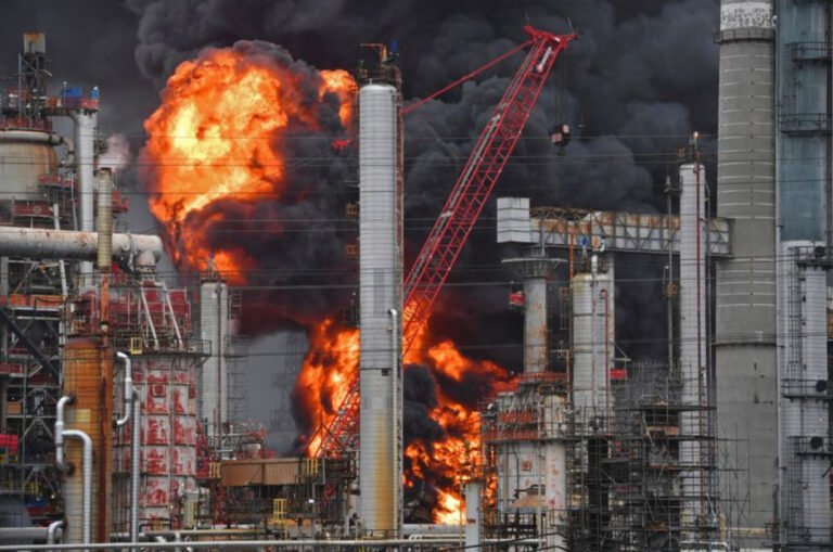 Од засега непознати причини во рафинеријата избувнал пожар, а на небото се издигнале густи црни облаци од чад. Пожарот беснееше повеќе од пет часа.