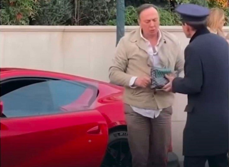 На видеото може да се забележи како тој пристугнува, го остава возилото на паркирање и заедно со неговата сопруга влегува во хотелот.