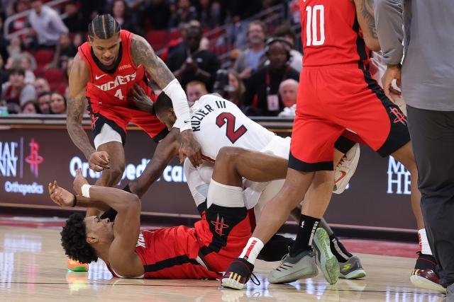Тепачка и седум исклучувања го одбележа натпреварот помеѓу Хјустон и Мајами во НБА лигата, кој гостите го добија со 104:100 Тензијата во мечот кулминираше на 30 секунди до крајот, кога по навидум безопасна ситуација, Амен Томпсон, бекот на Хјустон, го повлече Тајлер Хиро и го фрли на подот.