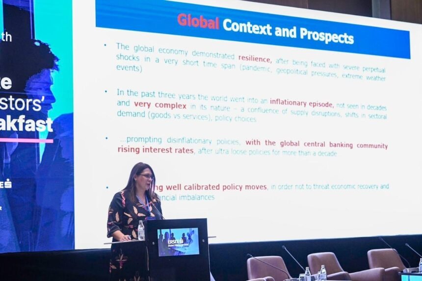 Инфлацијата е стабилизирана, додека централните банки внимателно ја нормализираат својата монетарна политика. Основните каматни стапки иако се намалуваат, сеуште се на повисоко ниво. Се очекува големите централни банки (Европската централна банка и Федералните резерви) да продолжат со олабавување на своите монетарни политики и во текот на 2025 година. Притоа, суштинска ќе биде координацијата помеѓу монетарната и фискалната политика, односно поддршката во понатамошното закотвување на инфлацијата преку фискалната консолидација, посочи вицегувернерката на Народната банка, Ана Митреска во своето обраќање на единаесетото издание на конференцијата „Ерсте инвесторс брекфаст“, којашто традиционално ја организираат „Ерсте банка“ и „Шпаркасе банка“.