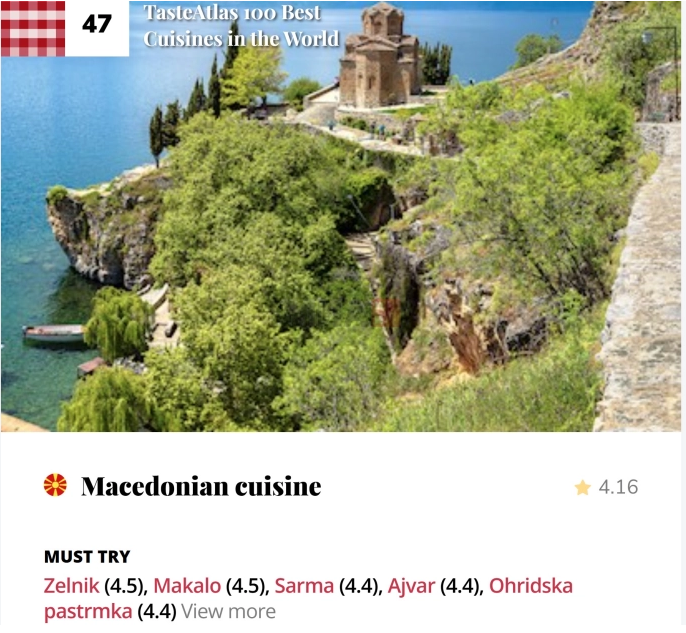 Популарниот гастрономски портал за храна и патувања, „Тејст атлас“ (Taste Atlas) ја објави листата на 100 најдобри национални кујни во светот за 2024 – 25 година. Македонската кујна го зазеде 47. место (со оценка 4,16 од 5).